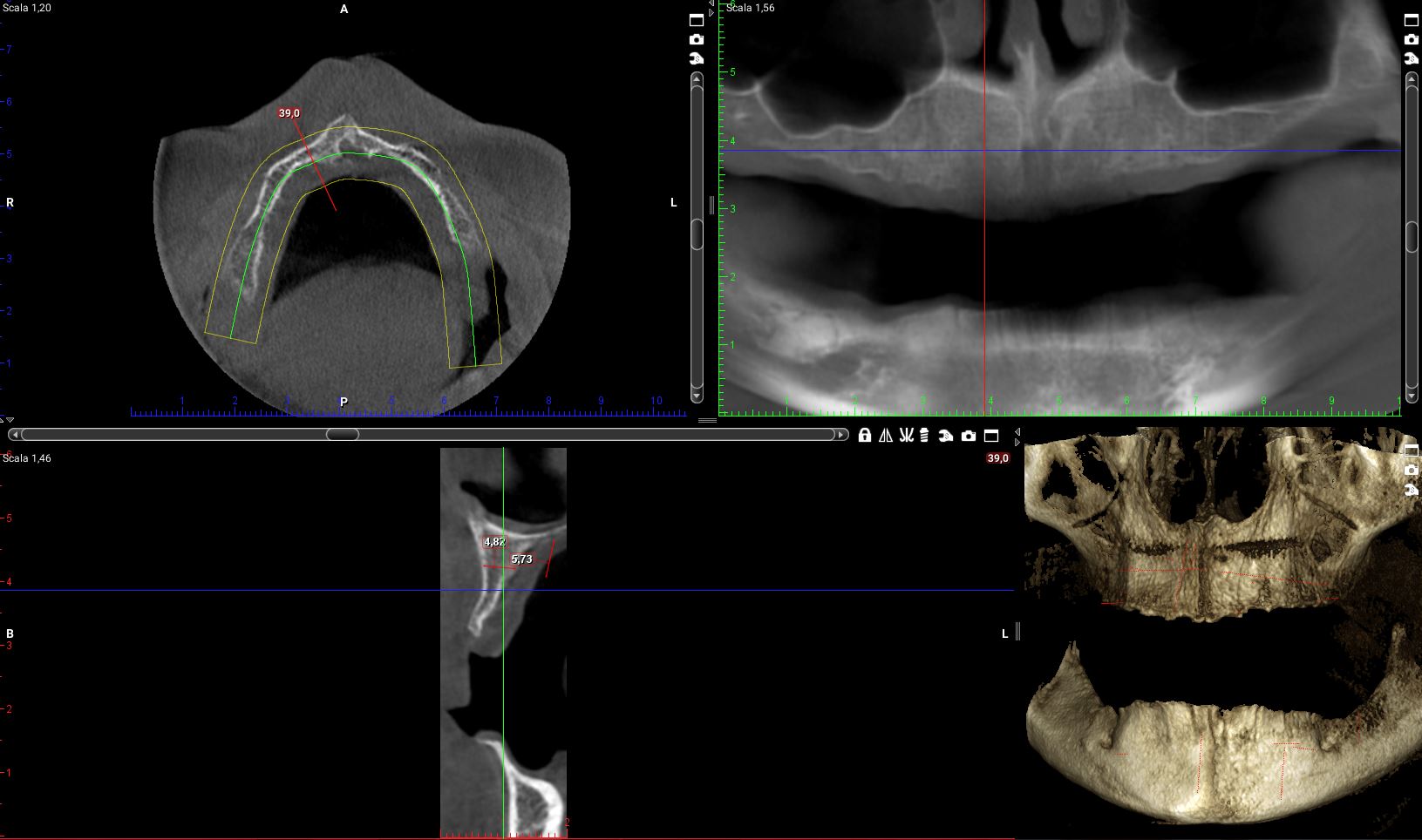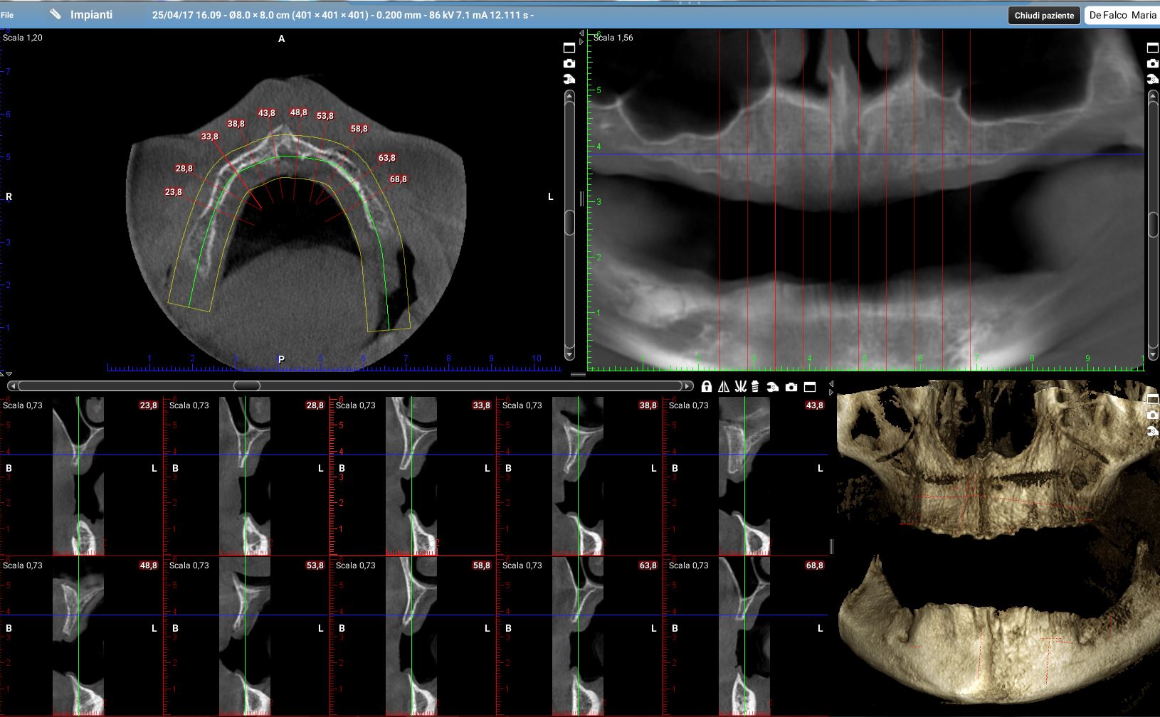 Ora riprendiamo i tagli della cone-beam della mia paziente in corrispondenza delle zone dove dovrò posizionare i quattro impianti.