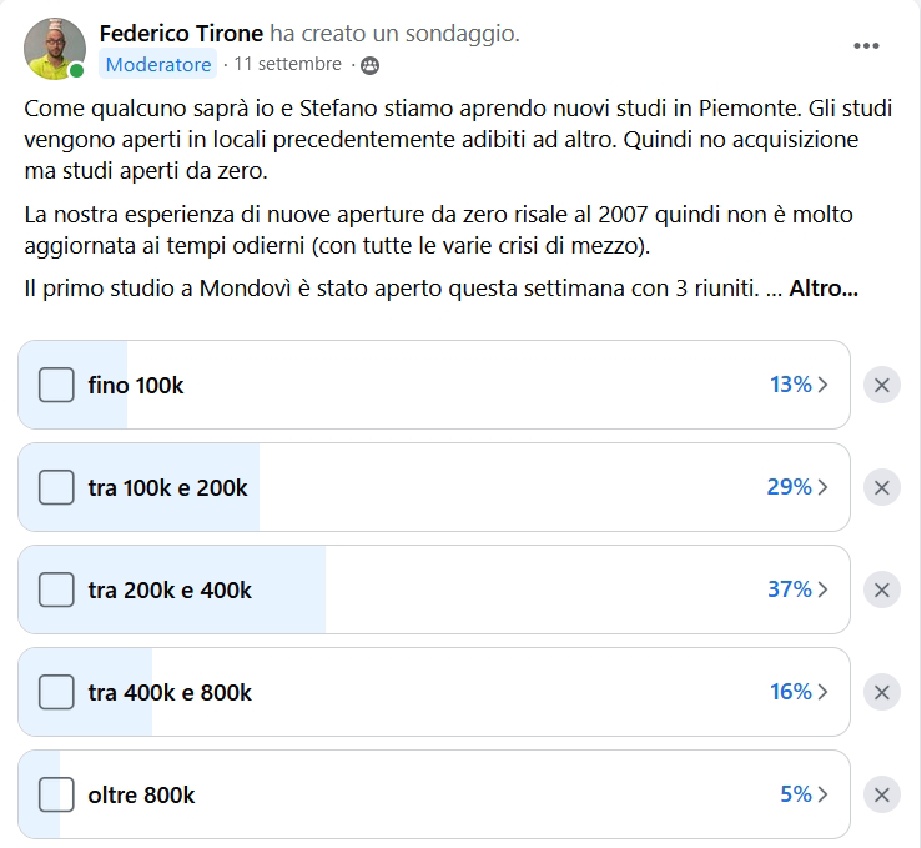 Il sondaggio pubblicato ad inizio settembre ha ricevuto la risposta di 419 colleghi. Per il 40% di loro il fatturato del primo anno del nostro nuovo studio di Mondovì sarà inferiore ai 200k. Per il 76% del totale non supererà i 400k.