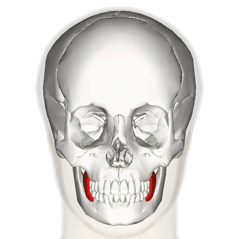 Quello rosso è il muscolo buccinatore. Lateralmente e un po’ posteriormente c’è il muscolo massetere.