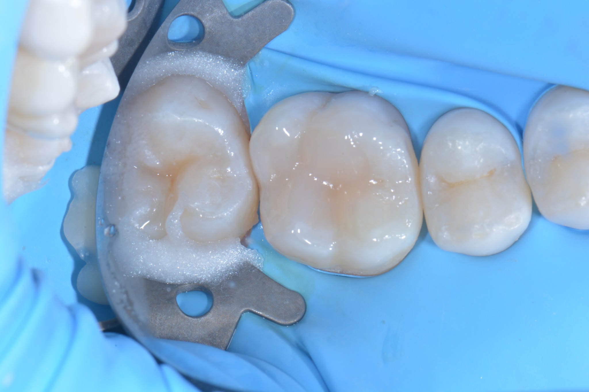 A partire dalle fasi di mordenzatura o sabbiatura il teflon protegge i denti adiacenti senza creare spessori, resta aderente alle superfici, può essere invaginato sotto gengiva. Quando arriva il momento di rimuoverlo scivola via semplicemente ed è pure bello per la documentazione fotografica, soprattutto per l’effetto che fa quando ci lasci qualche goccia d’acqua…