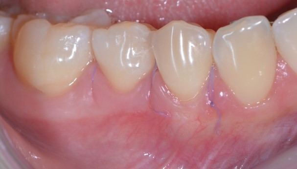 Ho semplicemente cancellato via i punti di sutura. Sì perché quello è proprio l’aspetto della guarigione a 10 giorni di un lembo a spostamento coronale multiplo con innesto di connettivo prelevato dal palato! Concorderai con me che è un intervento abbastanza “aggressivo”. Si deve scollare un lembo a spessore misto, sezionale le fibre muscolari, spostare coronalmente il lembo, prendere un pezzo di “gengiva” dal palato (qui di solito i pazienti rabbrividiscono) e ficcarla sotto il lembo.