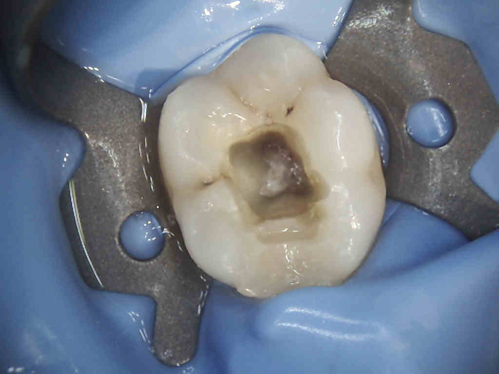 Sono sicuro che inserendo un file nei canali avrei avuto un sanguinamento e forse anche dolore, ma se non ho tempo di finire la cura preferisco affidarmi a una pallina di cotone impregnata di eugenolo e sull’effetto distensivo che l’apertura della camera dà sulla pressione intracamerale…