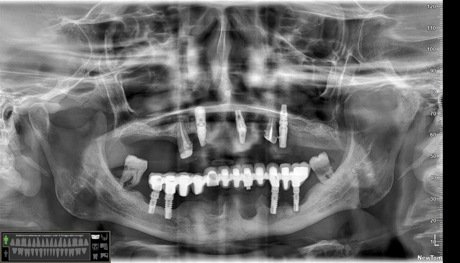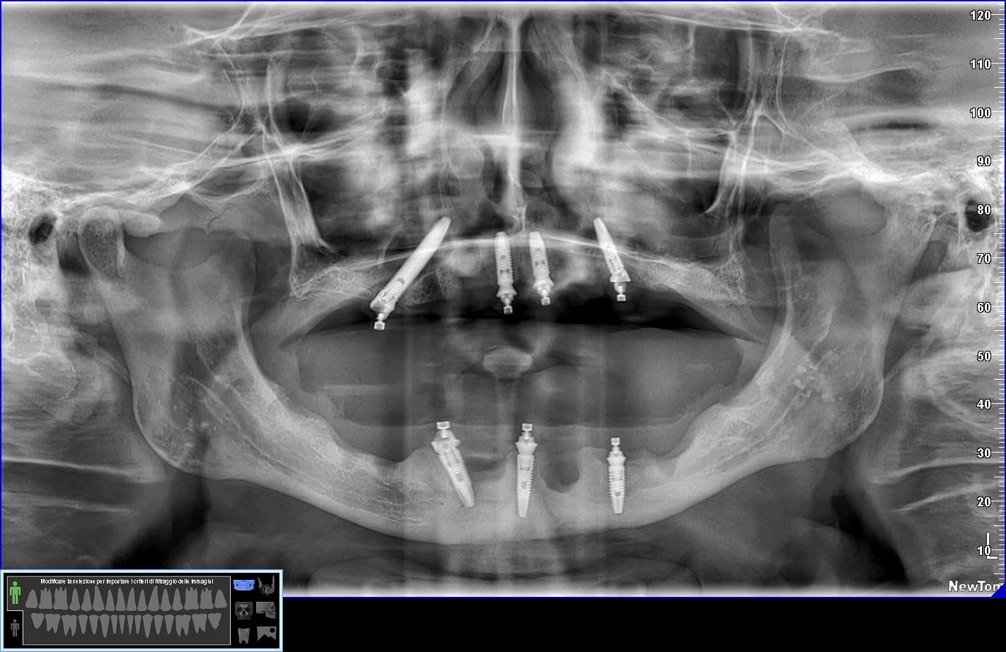 Ah… questa è la panoramica finale, inferiormente non ho trovato il modo per mettere 4 impianti ma solo tre… vedremo se aggiungerne uno. E non farti ingannare dall’immagine: il mentoniero di destra non è quello che sembra più distale ma quello meno visibile più mesiale.😎